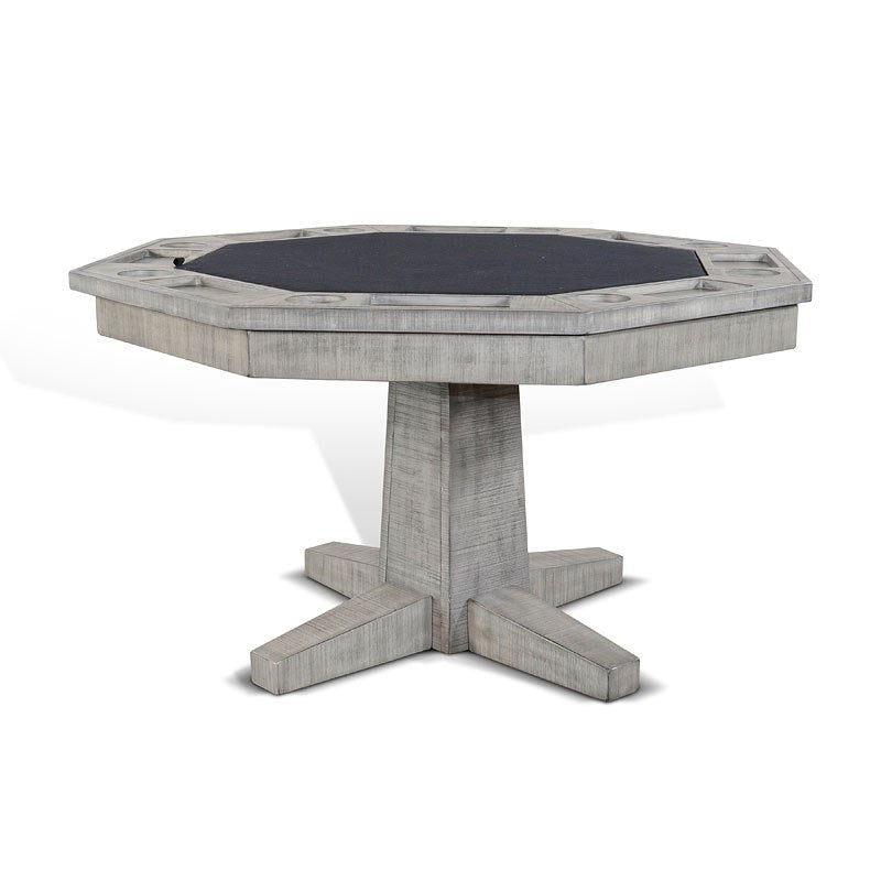 Enhance the look of your game room with this beautiful Alpine Grey Game and Dining Collection by Sunny Designs Brand. The multi-functional design features a large planked wood top for regular dining. The game side features card-friendly black felt, cup, and chip holders, with enough space to accommodate eight players. This set comes with four leather swivel chairs.
