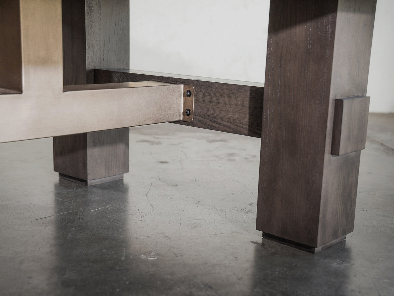 Rugged and somewhat industrial in appearance, the Kemp's design utilizes gray colors, metal, and raw wood without too many frills, a design style still gaining in popularity. The grain of the Australian white mahogany stands out attractively in its Grayson Grey finish, and the box joints and fitted square-beam construction of this table draw the eyes in and seem to radiate warmth and strength.